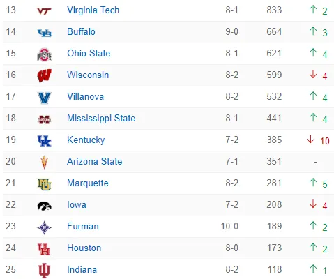 - Furman Paladins: No han sido nombrados con anterioridad al merecer capítulo aparte, ya que ni estaban entre los favoritos a lograr el título de la SoCon, Southern Conference, pero los de Bob Richey han sido los autores de dos de los upsets más grandes de lo que llevamos de temporada, siendo capaces de derrotar primero en su casa a un equipo que llegó a la Final Four como Loyola Ramblers con un mate sobre la bocina de Clay Mounce, y posteriormente vencer en la pista del actual campeón, Villanova Wildcats, en la prórroga, victorias que provocaron la entrada de este no muy grande programa en el Top 25. A día de hoy son uno de los nueve equipos que se mantienen invictos y en esta semana, han sido capaces de lograr dos victorias en casa, primero ante Charleston Southern (77-69) y posteriormente ante UNC Wilmington (93-50).
