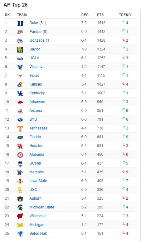 En él, como ya se ha comentado, Duke se coloca en la primera posición, seguido de la sorprendente Purdue, de Gonzaga pese a la derrota y de otra invicta como es la actual campeona Baylor.
