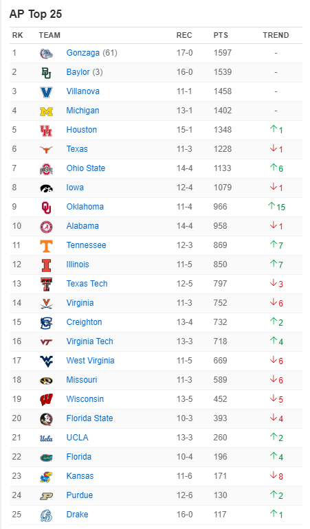 Comenzando con el repaso a lo ocurrido encontramos a dos equipos que están por encima del resto a una distancia importante: Gonzaga Bulldogs y Baylor Bears. Así, encabezando el ranking de la AP, se encuentran los Zags que se han mostrado intratables y que acumulan 17 victorias en otros tantos partidos, todos ellos por más de 10 puntos salvo frente a West Virginia a la que “solo” fueron capaces de vencer por 5 puntos. Ya en la temporada de conferencia, en una conferencia de nivel medio como la WCC, han demostrado su poderío y no han bajado nunca de los 15 puntos de diferencia a pesar de haberse enfrentado ya a sus teóricos rivales por el título y máximos competidores como son BYU, USF y St. Mary’s. Y todo ello, gracias a una plantilla de enorme calidad que cuenta con uno de los mejores jugadores del país en su base Jalen Suggs, dos aleros carne de NBA como el francés Joel Ayayi y el tirador Corey Kispert, un interior de mucha calidad como Drew Timme y un banquillo de jugadores principalmente internacionales que, a buen seguro, serían titulares en la mayoría de conjuntos de la DI, como son el canadiense Andrew Nembhard, el malí Oumar Ballo o el boricua Julian Strawther.