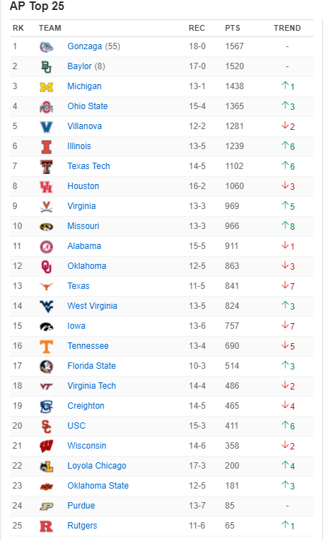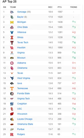Por otro lado, esta semana encontramos las apariciones en el ranking de USC, Oklahoma State, Loyola-Chicago y Rutgers, siendo el Top el mostrado a continuación: