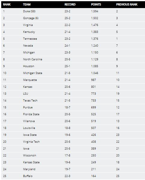 Nuevo repaso de la competición colegial estadounidense en la que hemos vivido un cambio en el liderato del TOP 25, ya que la derrota de Tennessee Volunteers en pista de Kentucky ha provocado que Duke vuelva a subir al número 1, siendo esta derrota, la caída más significativa de un favorito en toda la semana.