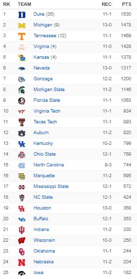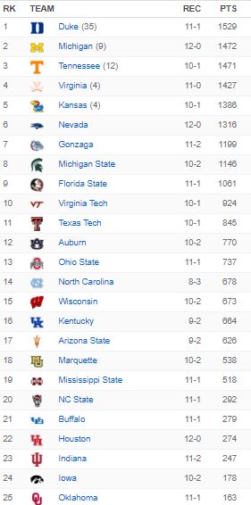 Ese mismo viernes se producían varios partidos para estos “veinticinco mejores” entre los que encontramos las victorias con mucha solvencia de dos equipos que cada vez se muestran como favoritos al título final como Gonzaga Bulldogs, sobre todo tras la vuelta de la lesión de Killian Tillie, y Michigan State Spartans que vencieron a Denver Pioneers y Oakland Grizzlies por 101-60 y 99-69 respectivamente. Ese mismo día jugaban las dos cenicientas del momento y que se encontraban invictos, Furman Paladins y Buffalo Bulls. Los Paladins viajaban hasta Baton Rouge para enfrentarse a un equipo que hasta entonces estaba rindiendo por debajo de lo esperado, LSU Tigers, pero el alma mater de entre otros Shaquille O’Neal, demostraba por qué estaban considerados uno de los equipos a dar la sorpresa de la temporada y se imponían de manera rotunda (75-57) a unos Paladins que se mostraban vulnerables por primera vez en toda la temporada y eran devueltos a la realidad por los de Will Wade. Sin embargo, el choque más interesante de la noche era el que enfrentaba a los Bulls contra otro Top 20 como Marquette en la pista de los Golden Eagles, en un choque que mostraba la igualdad de ambos conjuntos en la primera mitad y la causa de que los de Nate Oats hubieran vencido previamente a equipos como West Virginia o Syracuse, pero en la segunda parte un acierto imparable de los Golden Eagles, especialmente de su combo Markus Howard -40 de sus 45 puntos en la segunda mitad con 9 de 13 en tiros de 3 y 12 de 12 en tiros libres- provocaba la primera derrota de los de Buffalo por 103-85.
