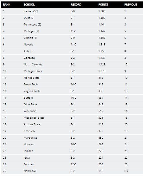 Antes del parón navideño se publicaba un nuevo Top 25 el propio día 24, si bien no habría más baloncesto de estos conjuntos hasta el día 28, siendo el baloncesto universitario amenizado por los partidos del Hawaiian Airlines Diamond Head Classic en el que TCU vencería a Indiana State por 83-69. Este top 25 quedaba de la siguiente manera con la aparición de Oklahoma Sooners y North Carolina State: