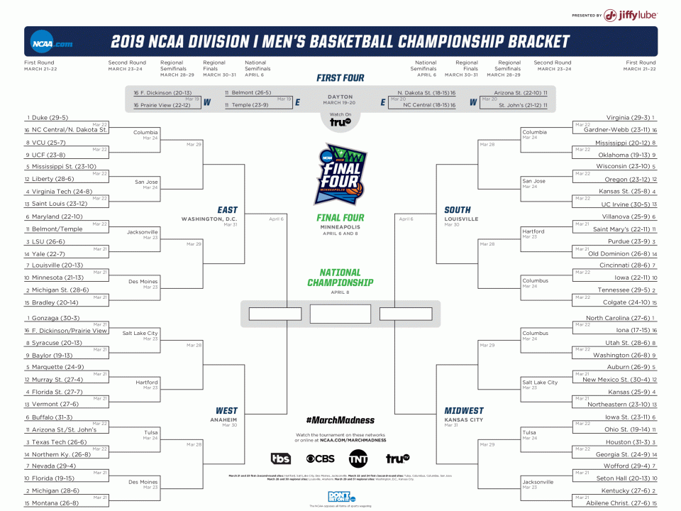Terminó la temporada con los torneos de conferencia y el comité realizó su función de manera que los 68 equipos fueron seleccionados para disputar el campeonato universitario. Llegó el momento de la Locura de Marzo. El torneo queda compuesto con un cuadro como el siguiente:
