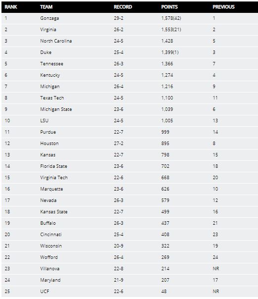 En este Top 25 entran Villanova Wildcats de nuevo y UCF Golden Knights mientras que salen Iowa Hawkeyes y Washington Huskies.