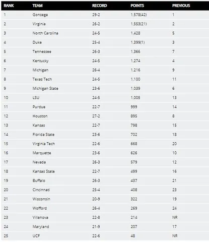 Nos adentramos en la última semana de liga regular en las grandes conferencias, última de verdad en la que los rankings importan ya que desde el próximo lunes, lo verdaderamente importante serán los win or go home, los partidos definitorios, primero de los torneos de conferencia que dan automáticamente billete al torneo final, la March Madness y a partir del día 19 de la Madness. Con ello, el último Top 25 de la temporada del que hablaremos es el siguiente: