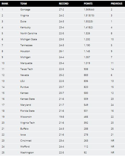 Una nueva semana en la competición universitaria y un nuevo cambio de número 1, ya que es una Gonzaga líder de una mid-major como la WCC, la que encabeza un ránking en el que Duke ha perdido este primer puesto tras su derrota ante North Carolina en una semana en la que entran en el ranking Cincinnati Bearcats, Wofford Terriers y Washington Huskies, saliendo del mismo Iowa State, Louisville y Villanova.