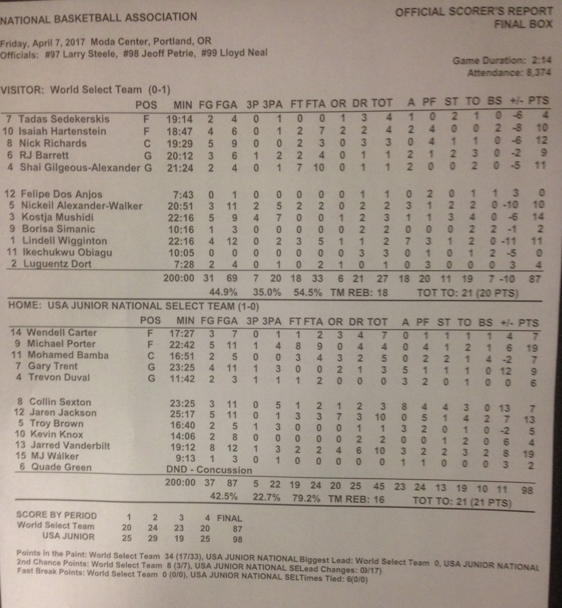 Aunque fueron con bajas muy importantes, seis de los jugadores del combinado de USA estuvo en el pasado Mundial U17. Los Carter Jr, Jackson, Knox, Brown, Sexton (MVP) y Trent Jr dominaron del principio a fín, capaces de arrasar a Turquía por 96-56. En el partido del Nike Hoop Summit de esta madrugada tuvieron una buena participación, especialmente Jaren Jackson y sobretodo Collin Sexton quién tuvo algunas de las acciones más espectaculares del partido.