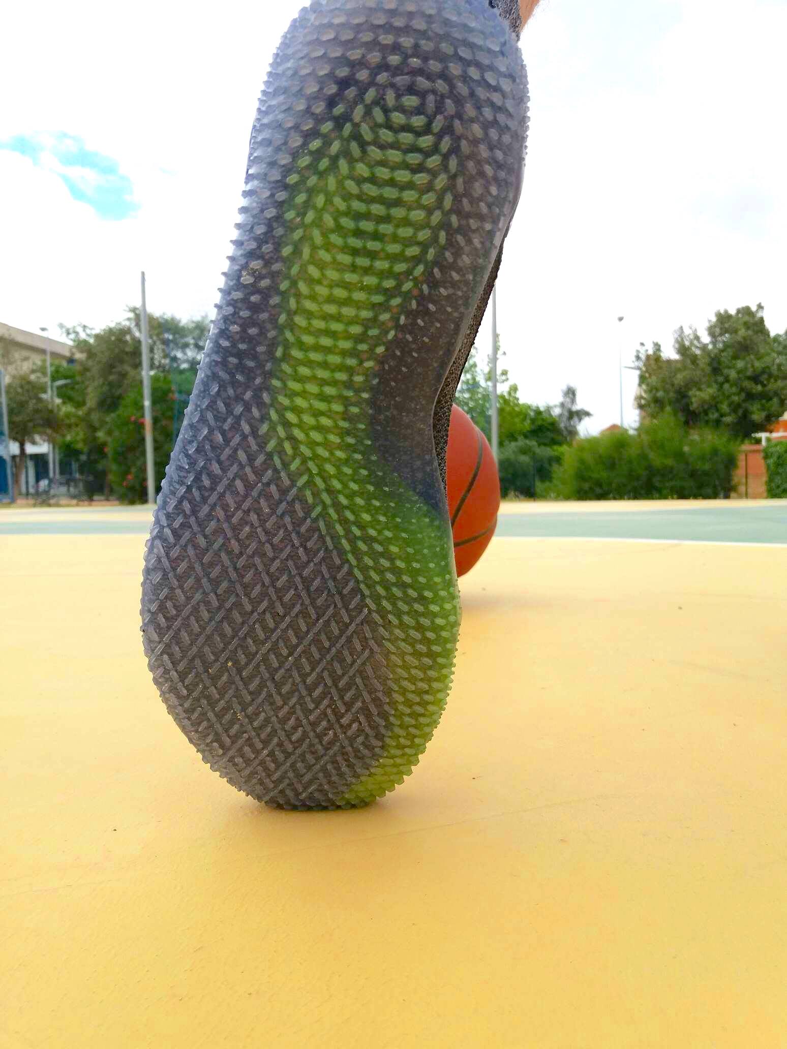 En cuanto a la tracción, es formidable en canchas interiores y desastrosa en pistas exteriores. En parquet, los pequeños nódulos de goma de la suela se adhieren con mucha eficacia, consiguiendo un agarre sobresaliente. Los bordes son redondeados, muy apropiados para realizar crossovers y cambios de ritmo. Sin embargo, en pistas de cemento la cosa cambia de forma radical, ya que los nódulos apenas responden a los movimientos, por lo que es como si no estuvieran. Los bordes redondeados, lejos de ayudar, terminan de componer una capacidad de tracción muy mejorable. Si vas a jugar en pistas interiores, esta es tu zapatilla, pero si sueles jugar en canchas al aire libre, más vales que te busques otro modelo.