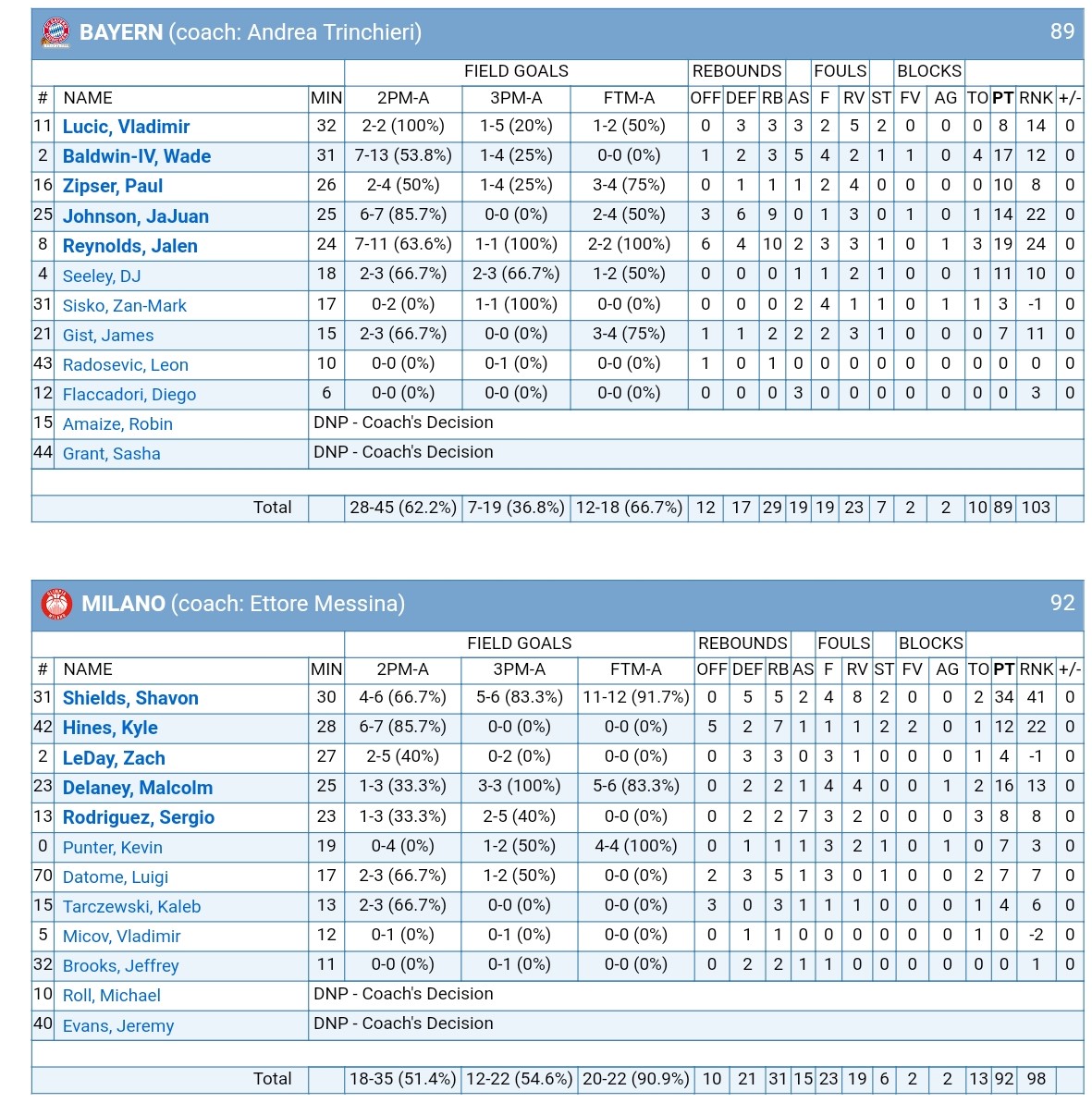 OLIMPIA MILANO 92-89 bayern münchen