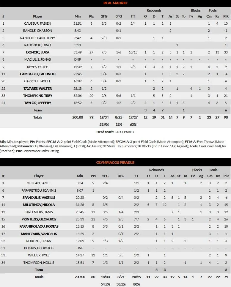 En el último acto, las fuerzas estaban muy igualadas, el partido se espesó y las defensas se impusieron a los ataques. El Real Madrid confió su futuro al talento de Doncic pero falló. Un Olympiacos más coral se impuso en un final apretado pero donde el equipo griego nunca dio la espalda al partido y se llevó la victoria a tierras del Pireo por 79-80.
