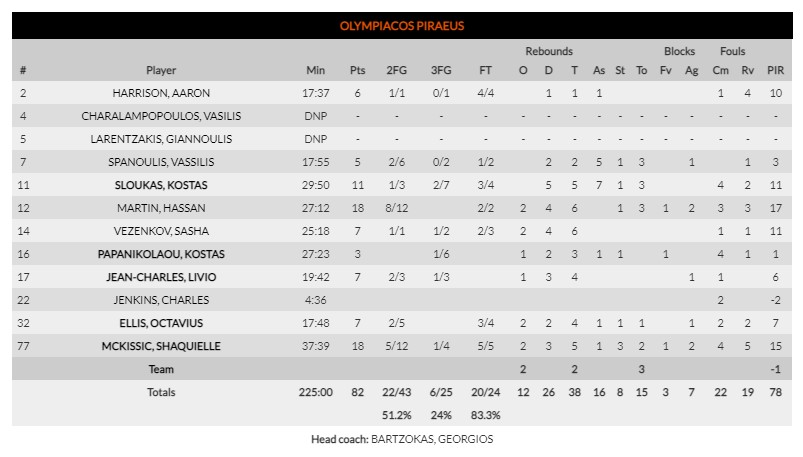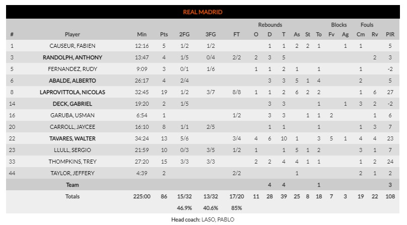 La victoria del Real Madrid fue de las más sufridas en esta Euroleague, y para ello necesitaron de las mejores versiones de varios jugadores de la plantilla. Nico Laprovittola, Trey Thompkins y Walter Tavares sobrepasaron los 20 créditos de valoración, por lo que podemos hablar de un MVP tripartito. El primero finalizó el encuentro por todo lo alto desde la línea de tiro libre y con una valoración de +27 (19 puntos, 2 rebotes y 6 asistencias). En lo que se refiere al cabo verdiano, Tavares acabó el encuentro con doble-doble y con 5 tapones, protegiendo el aro como el sabe. Por último, Trey Thompkins ejecutó al Olympiacos desde la línea de tres, anotando 3 de 3 y en los momentos que más lo necesitaba su equipo.