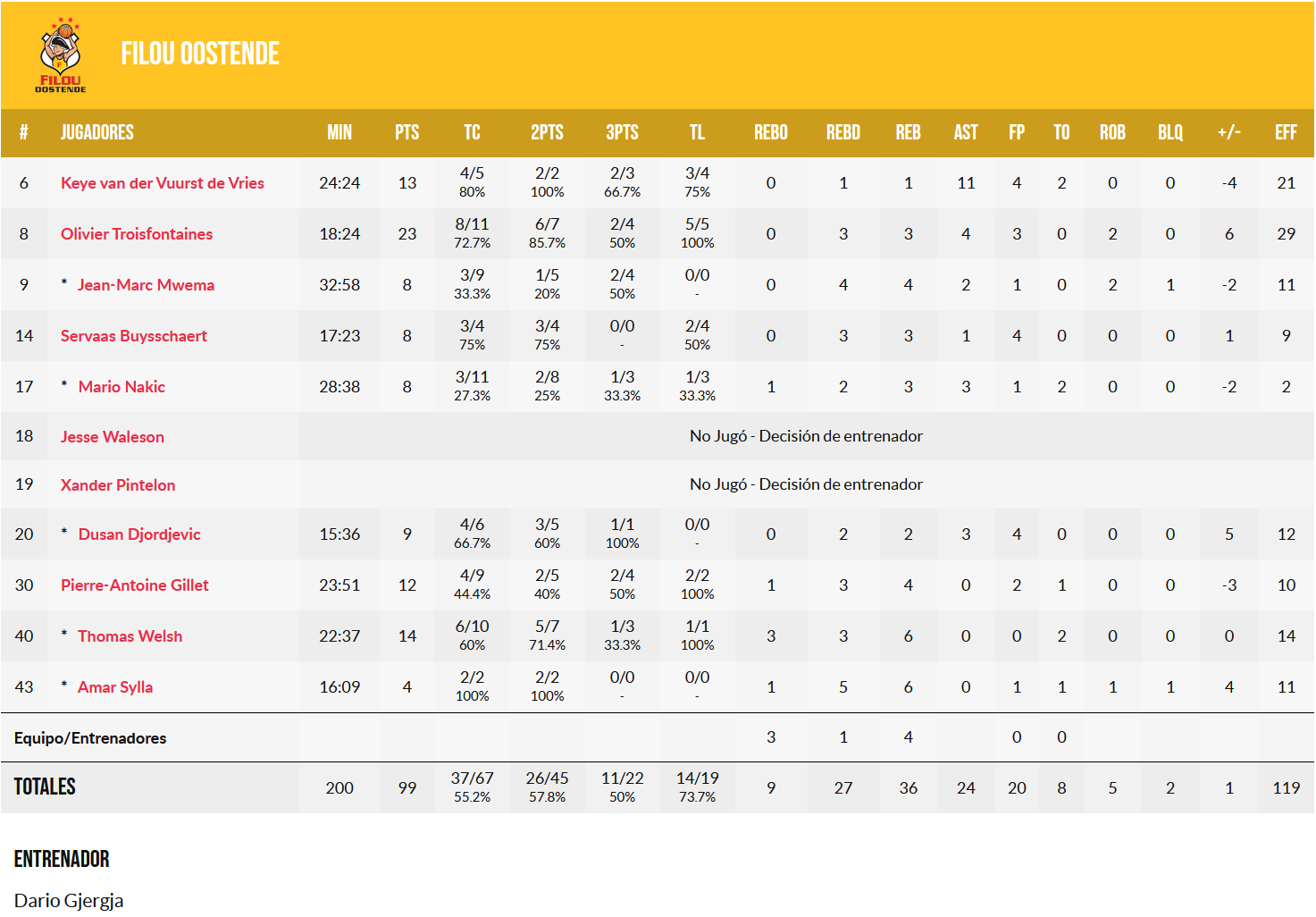 Partidazo del veterano escolta del Filou Oostende que hizo valer sus galones para anotar en todas las posiciones posibles y firmar 23 puntos, 3 rebotes y 4 asistencias para 29 de valoración. El belga fue clave, acumulando muchos balones y presión defensiva, al tiempo que se jugó varios balones complicados que acabaron en canasta y terminaron por ser decisivos. Aguantó a los suyos en la primera mitad y decidió en la segunda. Su partido quedó afeado por una disputa con Jordan Sakho al que impidió sacar de fondo y que terminó en antideportiva para el pívot burgalés mientras el belga se fue sin castigo.