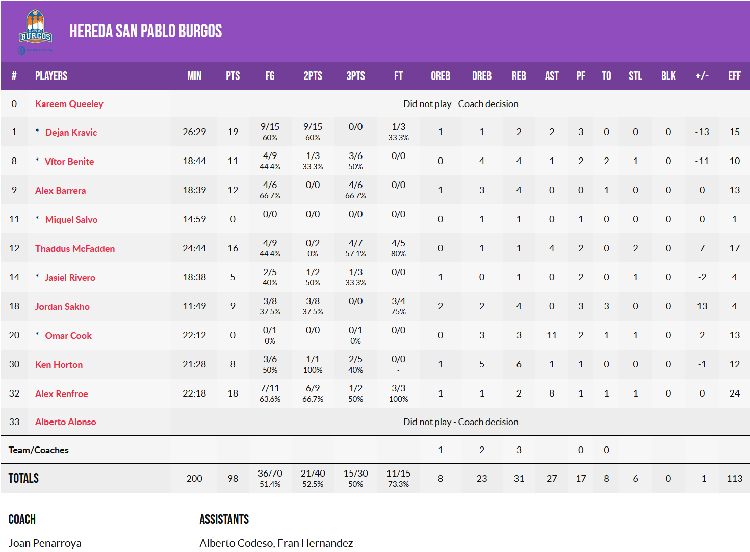 Omar Cook es un jugador de otro tiempo, y no estamos haciendo chistes baratos sobre su edad. El norteamericano tiene una visión de juego impresionante, que le permite ver huecos donde otros jugadores no ven nada y le habilita para ser decisivo sin anotar ni un solo punto, pero repartir 11 asistencias y ser uno de los mejores de su equipo. A su lado, otro base fuera de serie, Alex Renfroe, anotó 18 puntos y repartió 8 asistencias. Todo un lujo en un equipo que acumula muchos tiros liberados y que,a demás, puede ‘alimentar’ a un jugador tan decisivo como Dejan Jravic que, a pesar de no tener su mejor noche, se fue con 19 puntos.