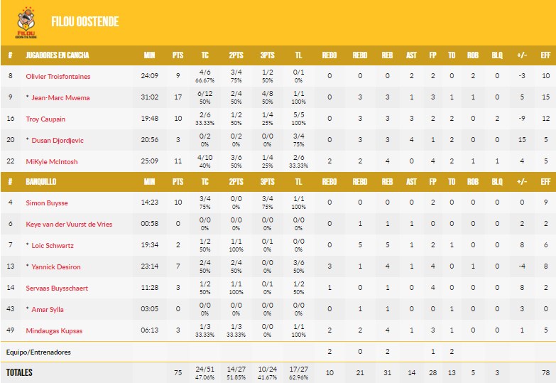 El acierto triplista siempre mantuvo las ventajas belgas. Filou Oostende fue superior durante todo el partido al Canarias y estuvo por delante desde el 2 a 2 inicial. Cada vez que Iberostar se acercaba, los belgas respondían con un triple con un gran acierto conjunto, como muestra su 10 de 24. El más destacado fue Jean-Marc Mwema con 4 de 8 en triples y 17 puntos, pero también el joven Simon Buysse anotó triples claves con un 3 de 4, dos de ellos en el último cuarto.