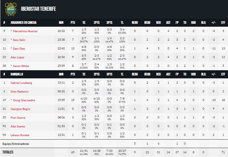 Sin Marcelinho no hay samba. El base brasileño jugó hoy uno de sus peores partidos con la camiseta de Iberostar Tenerife y su equipo lo notó mucho. No fue solo por sus números de 7 puntos, 4 asistencias y 5 de valoración, sino porque en ningún momento consiguió que su equipo tuviera fluidez en ataque y ese juego espeso se transformó en un 21 de 51 en tiros de campo. Álex López intentó suplirlo y realizó un buen partido con 13 de valoración pero no fue suficiente para los canarios que están acostumbrados a la excelencia de su base titular.