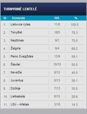 En la parte más baja y ya casi deshauciado encontramos a LSU-ATLETAS, equipo de un barrio de Kaunas que juega en el mítico (y el adjetivo no es gratuito) Kaunas Sports Hall, lugar que huele a sentimiento nacionalista lituano y a grandes noches de baloncesto, tiene todas las papeletas para acabar en NKL. Con solo 3 victorias ni los más optimistas sueñan con gestas y milagros. Como mal menor siempre podrán decir que descendieron con más dignidad que su predecesor, Naglis Palanga, que en la 2012/13 se fue al hoyo sin una mísera victoria en toda la fase regular.