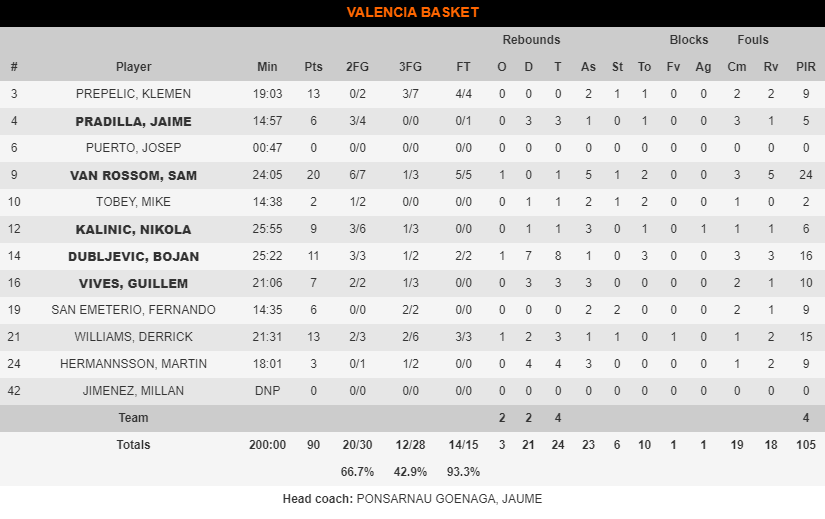Una de las cosas más positivas de este encuentro fue que se confirmó la buena tendencia de Derrick Williams. El jugador no estaba siendo uno de los mejores fichajes de los valencianos y poco a poco va ganando protagonismo en el juego y aporta mucho más de lo que resta. Hoy anotó 13 puntos y capturó 3 rebotes en 21 minutos. Sin duda, una buena noticia. Algo parecido sucede con Prepelic, que fue también importante en el partido con también 13 puntos. Ambos completaron la labor de Van Rossom y de Dubljevic, dos pesos pesados del vestuario de Valencia Basket.