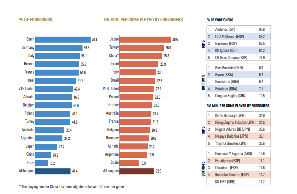 La liga española cuenta con muchos de los mejores jugadores de Europa y es el campeonato doméstico que más equipos aporta a competiciones continentales, donde 11 de los 18 clubes disputan Euroliga (4), Eurocup (3) o Basketball Champions League (4). Ahora bien, a pesar del elevado número de extranjeros, los jugadores españoles son los que tienen una menor brecha de minutos con los foráneos, jugando solo seis minutos menos (11 de media) y anotando 3’3 puntos menos de media en Liga Endesa. Curiosamente, son las ligas turca, italiana y rusa las que mayor distancia sufren con 13, 13 y 11 minutos de diferencia respectivamente en la temporada 2018/19.