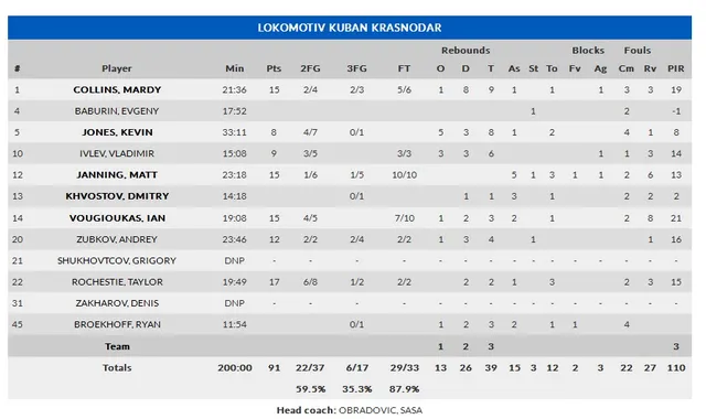 1. Igualdad desde diferentes premisas. Casi roza la redundancia volver a repasar las bajas de Fuenlabrada, que ha arrastrado durante todo el curso una gran cantidad de problemas físicos y que hoy afrontaba su primer duelo sin Moussa Diagné, ya de vuelta en Barcelona. A este duelo contra Kuban no llegaba a la convocatoria Rafael Hettshemier, que aterrizó ayer y que hoy, tras las pertinentes pruebas físicas, ya lucía en chandal a escasos metros del banquillo madrileño, sin plenos derechos aún para jugar minutos. Su no-llegada dejaba a Fuenlabrada con una complicada rotación en la pintura, hecho que aprovecharía Obradovic para hacer aún más grandes las ya de por sí importantes diferencias entre la plantilla de pívots de uno y otro equipo. Fuenlabrada y Lokomotiv disputaban un igualado primer cuarto con idas y venidas y parciales para unos y otros que vinieron desde sus dos principales, marcados y diferentes recursos: primero golpearon los locales, que se anotaron su primer ventaja con un parcial de 0-4 a partir de canastas a 2 o 3 metros del aro, con un Fuenlabrada que tuvo muy difícil la tarea de la intimidación; acto seguido los locales asestarían un buen golpe para darle la vuelta a la tostada con un parcial de 8-0 y mucho acierto desde el exterior (cerraron los primeros diez minutos en un 71% de acierto desde los 6,75); con las mismas, tras unos minutos de intercambio de canastas, Kuban volvía a empatar el partido tras parcial de 0-6 con canastas todas ellas en la pintura, gran parte de ellas derivadas de su ventaja en el rebote ofensivo (6 de sus 11 capturas en el cuarto llegaron en el aro naranja) y de un Rochestie que en la primera mitad simplemente destrozó a la defensa local con 17 puntos en 11 minutos.