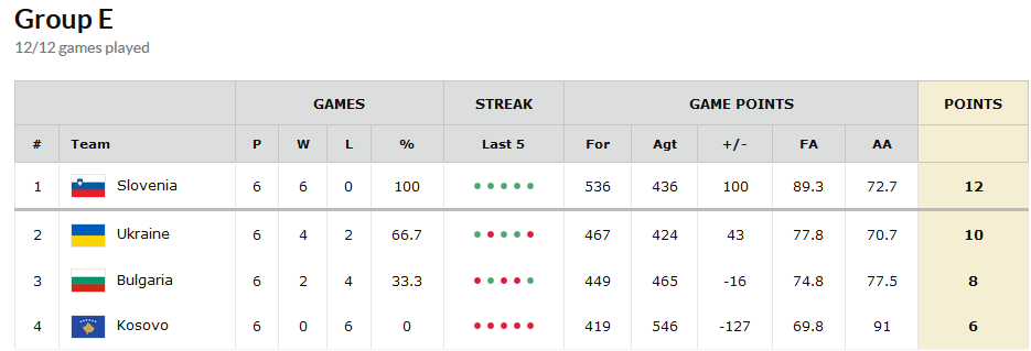 Grupo E: Eslovenia se clasifica para el Eurobasket como primera de grupo tras imponerse a Ucrania (69-80) en el último encuentro de la fase de grupos. Goran Dragic volvió a liderar a su equipo (22 puntos, 5 asistencias). Lukashov fue el mejor hombre de Ucrania (14 puntos, 7 rebotes). A pesar de la derrota, Ucrania también logra la clasificación para el Eurobasket. Bulgaria se impuso a Kosovo (62-67) en un partido en el que ya no había nada en juego y donde Scott Bamforth fue el mejor del encuentro con 21 puntos y 5 rebotes.