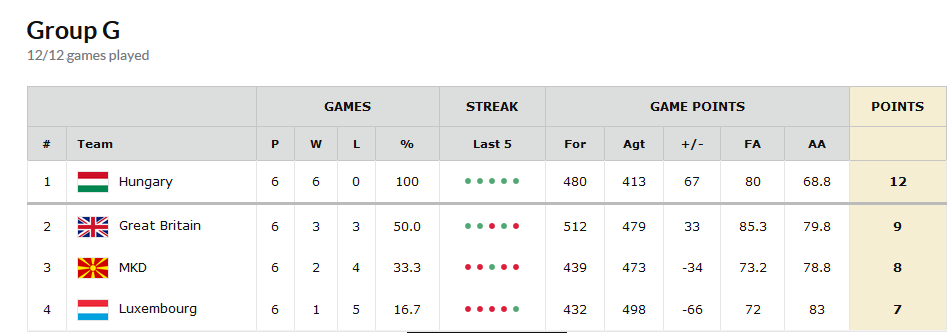 Grupo G: Hungría finaliza invicta su participación en el Preeuropeo y deja a Macedonia sin opciones. La selección húngara se impuso (63-61) a Macedonia y finaliza 6-0 su participación. Ferenz (18 puntos) fue el más destacado de su equipo. La labor de Kotoski (18 puntos, 7 asistencias) no fue suciente para los macedonios que quedan como una de las decepciones de estos clasificatorios. Luxemburgo derrotaba a Gran Bretaña en el otro encuentro del grupo (82-75). A pesar de la derrota, los británicos estarán en el Eurobasket 2017 al ser uno de los cuatro mejores segundos clasificados.