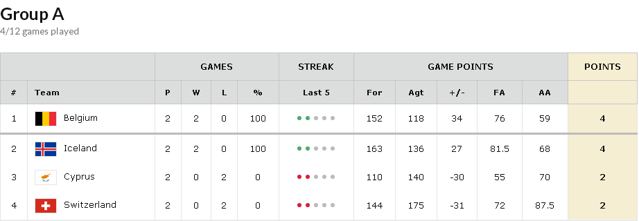 Dos claros favoritos en este grupo: Bélgica, liderada por Jonathan Tabú (sin Axel Hervelle, que está disputando la pretemporada con Bilbao Basket) y la siempre competitiva Islandia (para más mérito, sin su estrella, Jon Stefansson), que, de momento, se mantienen como los líderes del grupo y probablemente se disputarán entre ellos ese ansiado primer puesto final. El ex Joventut, Derrick Obasohan lideró la victoria belga ante Suiza con 18 puntos y 3 rebotes. Por parte de Finlandia, Hermannson brilló con 21 puntos, 6 rebotes y 6 asistencias en la victoria ante Chipre.