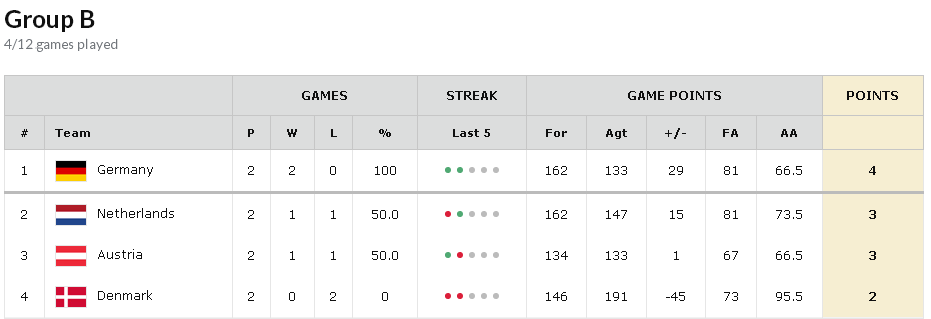 Alemania es la favorita para llevarse este grupo. En los dos primeros partidos, victorias ante Dinamarca y Austria, aunque sus vecinos se lo pusieron realmente difícil y pueden ser la revelación. En la victoria germana ante Dinamarca, destacó Paul Zipser con 17 puntos y 3 rebotes. El jugador del CAI Benzing también destacó (14+4), así como el ex de Barcelona Tibor Pleiss (10+9). Austria, que está compitiendo sin su gran promesa, Jacob Poetl (nº 9 del pasado draft de la NBA), logró su primera victoria ante Dinamarca con una actuación destacada del base del Morabanc Andorra, Thomas Schreiner (13 puntos, 5 rebotes y 5 asistencias). Otro jugador con experiencia en España, Schaftenaar, destacó en la victoria de Holanda con 11 puntos, 5 rebotes y 4 asistencias.