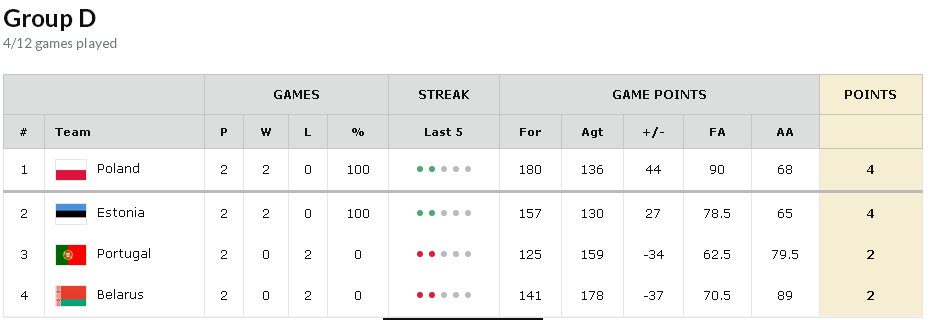 Polonia quiere sellar cuanto antes su clasificación en un grupo en la que es claramente superior al resto de selecciónes. De momento, dos victorias fáciles ante Portugal (con 10 puntos de Waczynski) y Bielorrusia (25+8 de Maciej Lampe). Estonia de momento les sigue la estela con las mismas victorias, con el base Veideman como jugador más destacado (16 y 32 puntos en sendos partidos). El próximo miércoles, ambas selecciones se enfrentarán para deshacer el desempate.