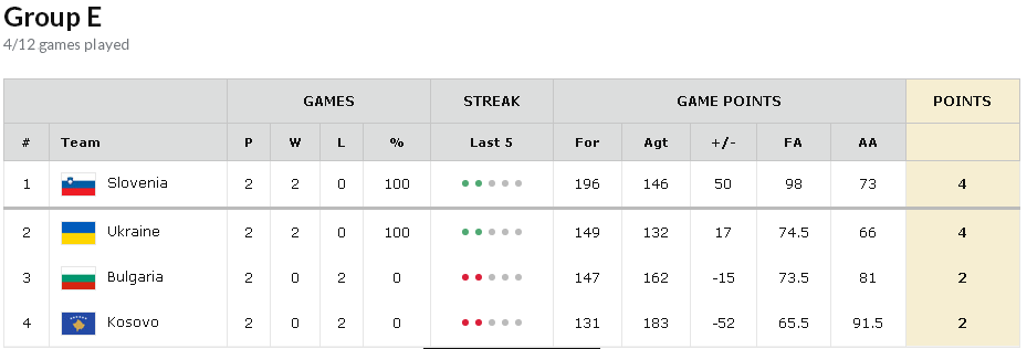 Uno de los grupos más atractivos del campeonato, por los muchos nombres conocidos que hay en las cuatro selecciones. Eslovenia amargó el debut de Justin Doellman con la selección de Kosovo (solo 7 puntos con 3/11 para el blaugrana) con 22 y 17 puntos de los hermanos Dragic y un 15+5 del exGranca Alen Omic. Ante Bulgaria, los 20 puntos de Goran Dragic fueron suficiente para hacerse con la victoria a pesar del partidazo de Alexandar Vezenkov (22 puntos). Edo Muric (Banvit) está siendo una de las grandes sorpresas de Eslovenia y de momento es el jugador mejor valorado de todo el campeonato. Ucrania, con un equipo más flojo que otros años, tampoco conoce la derrota con las mismas victorias que Eslovenia. Sufrieron para vencer a la Kosovo de Doellman (esta vez sí lideró, con 20 puntos), pero la buena actuación de Korniienko (20 puntos) pesó más en el resultado.