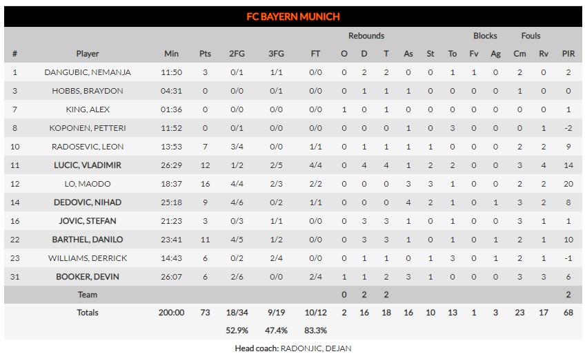 Seguía el uno alemán explotando el chollo para bajar a seis puntos la desventaja bávara (28-22 min. 12). Espesaba la cosa el equipo de Radonjic para retrasar alegrías tempranas locales con una defensa más ajustada y llegando hasta la pintura blaugrana para ganar el parcial del cuarto. Pero lo que ganaba delante, lo perdían detrás los alemanes, cediendo hasta cinco rechaces de su propio aro para que, de pronto y ya con Pangos en pista, la gota fuera menos fría (39-30 min. 17). Quería, pero no podía el Bayern y la buena conexión que comienzan a forjar Pangos y Tomic compensaba el buen periodo visitante para llegar al descanso en 44-36.