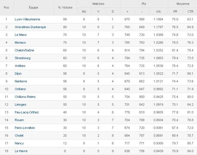 Se mantienen en lo más alto de la tabla, aunque con diferente número de partidos jugados, Lyon-Villeurbanne y Gravelines-Dunkerque tras superar a Limoges (52-64) y Paris-Levallois (71-59) con David Andersen (17p+10r+1a) y Marcus Dove (20p+6r+6a) como jugadores más destacados respectivamente.