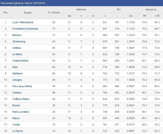 Le Havre consiguió su primera victoria de la temporada en la pista de un Cholet (77-84) que entra en puestos de descenso, con Angel Daniel Vassallo (30p+7r+3a) como jugador más destacado y tras remontar una desventaja de hasta 11 tantos. Precisamente, el equipo que sale de los puestos rojos es el Nancy, que en una sensacional segunda mitad consiguió dar la vuelta al marcador y superar con autoridad a Rouen (90-74). Uno de los grandes protagonistas del choque era Mickaël Pietrus, reciente fichaje del Nancy, pero su actuación no fue la mejor: 2 puntos, 2 rebotes y 2 asistencias sin ninguna canasta de campo (0/7 en triples). Saliendo desde el banquillo, Andy Panko (23p+5r+2a) fue el mejor del encuentro. A partir de la próxima semana no podrán contar con Florent Pietrus, ya que una lesión en el tendón de Aquiles le obligará a permanecer alejado de las pistas durante 6-8 semanas.