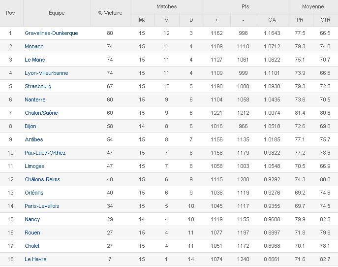 El tercer equipo en discordia del grupo perseguidor es el Le Mans, que tuvo que emplearse a fondo hasta el final para derrotar a Dijon (62-57). Los ex ACB Dozier, Gelabale y Lofton resultaron claves en un parcial de 11-2 mediado el último cuarto para abrir una pequeña brecha en el marcador y, liderados por el pívot Mouphtaou Yarou (14p+13r), dejar la victoria en casa. El partido fue la despedida de Robert Dozier del conjunto galo, que pone rumbo a Filipinas.