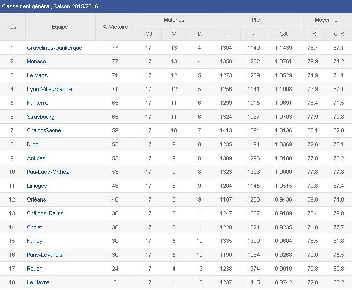 El segundo equipo que se quedó con la miel en los labios debido al average fue Pau-Lacq-Orthez. A pesar de emplearse a fondo en su visita a la cancha del colista, Le Havre, de poco le sirvió la victoria obtenida (78-85). El director de juego Michael Thompson (22p+3r+11a) fue el mejor jugador del partido y movió a los suyos como quiso.