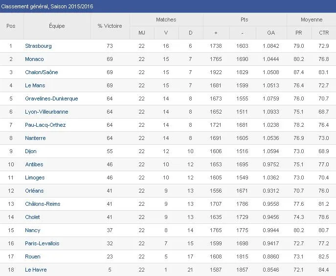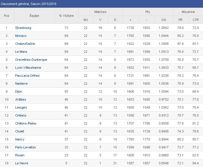 Les siguen de cerca a estos equipos en la tabla clasificatoria el Lyon-Villeurbanne, Nanterre y un Pau-Lacq-Orthez que sumó su 8ª victoria consecutiva a costa de Orléans (79-57), Limoges (90-76) y Antibes (64-68) respectivamente. Cabe destacar, como ya hemos dicho, la inmaculada racha del Pau-Lacq-Orthez gracias a un sensacional último cuarto (10-24) en el que dio la vuelta al marcador para mantenerse como el equipo más en forma de la liga.