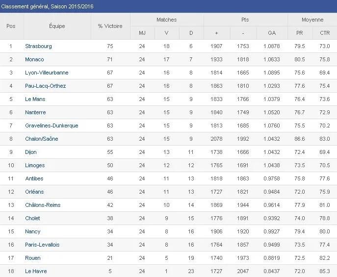Un paso más atrás se quedan Le Mans, Chalon/Saône y Gravelines-Dunkerque. Los primeros, muy flojos durante todo el partido, trataron de remontar en el último cuarto ante Châlons-Reims pero ya era demasiado tarde. Los segundos cayeron derrotados en un igualado choque contra Orléans. Y por su parte, el Gravelines logró una importante victoria ante Dijon para volver a abrir una brecha de dos victorias en la clasificación entre el octavo y el noveno puesto. Los equipos que disputarán el playoff por el título parecen cada vez más definidos.