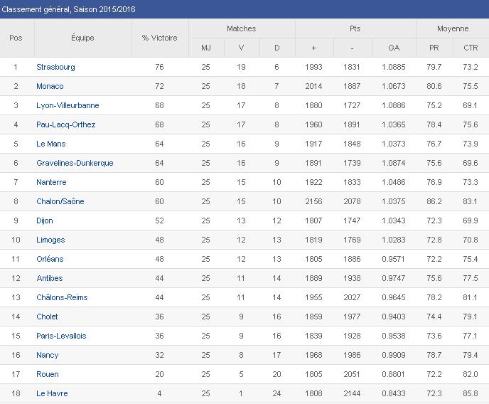Dos equipos que prácticamente se aseguraron su presencia en los playoffs fueron Gravelines-Dunkerque y Le Mans, aunque seguirán luchando por quedar entre los 4 primeros para conseguir el factor campo. Sus oponentes fueron Limoges (78-54) y un rival directo como Nanterre (84-82) respectivamente. Precisamente, Chris Lofton (21p+4a) fue uno de los jugadores más destacados de un encuentro que Le Mans remontó en el último período con sendos aciertos de Tywain McKee (19p+4r+4a+2rob) desde el perímetro. Mykal Riley tuvo el triple ganador en sus manos pero no acertó. No obstante, a pesar de la derrota de los suyos, el gran protagonista fue el visitante Jeremy Nzeulie, autor de 33 puntos. Destacar también el duelo interior entre los prometedores pívots Mouphtaou Yarou (14p+12r+2a) y Mouhammadou Jaiteh (16p+8r+2t).
