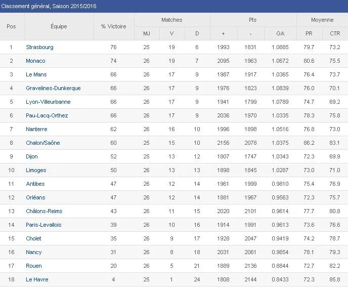 La jornada 26 de la Pro A, disputada entre semana, tan solo tuvo 7 partidos debido a la participación de Chalon/Saône (FIBA Europe Cup) y Strasbourg (Eurocup) en competiciones europeas. Sus respectivos encuentros ante Le Havre a domicilio y Dijon en casa ya tienen fecha: el 6 de abril (20:00) y el 12 de abril (19:00). Mientras tanto, el AS Monaco dio la vuelta a su partido frente a Orléans (81-76) en el último cuarto gracias a un parcial de 15-2 liderado por Sergii Gladyr, autor de sus 10 puntos en ese período, e iguala en el número de victorias al Strasbourg en lo más alto de la tabla.