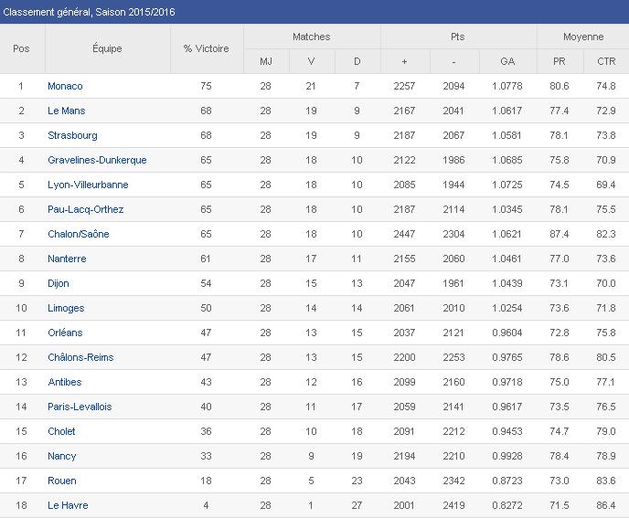 La Jornada 28 dejó como destacado líder de la Pro A al AS Monaco, que de la mano de un gran Jamal Shuler (25p+4r+5a) superó sin apuros al colista Le Havre (82-65) y aprovechó las 3 derrotas consecutivas que acumula el Strasbourg debido al sobresfuerzo en la Eurocup para ocupar esta privilegiada posición. Las dos últimas, ante Le Mans (66-82) y Dijon (77-54) en el encuentro aplazado de la J26.