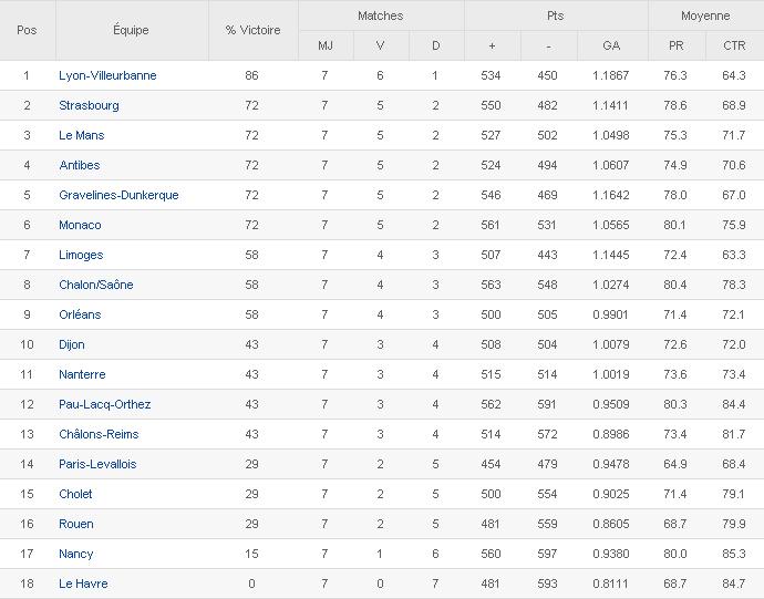 Se han tenido que disputar 7 jornadas para ver a un equipo liderando en solitario la tabla clasificatoria. Es el caso del Lyon-Villeurbanne, que superó con autoridad (85-55) a un Le Havre que sigue sin poder saborear la victoria y se queda como colista de la Pro A. El jugador más destacado del encuentro fue un viejo conocido en España como David Andersen, autor de 18 puntos, 3 rebotes y 2 asistencias.