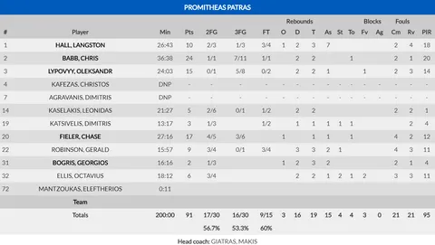 - Promitheas Patras, lanzar un triple era como lanzar en una piscina: un martillo desde el 6,75. Se fue con 9/15 al descanso en lanzamientos de tres y finalizó el encuentro con 16/30. Chriss Babb fue el máximo baluarte de los visitantes desde el perímetro al anotar siete triples.