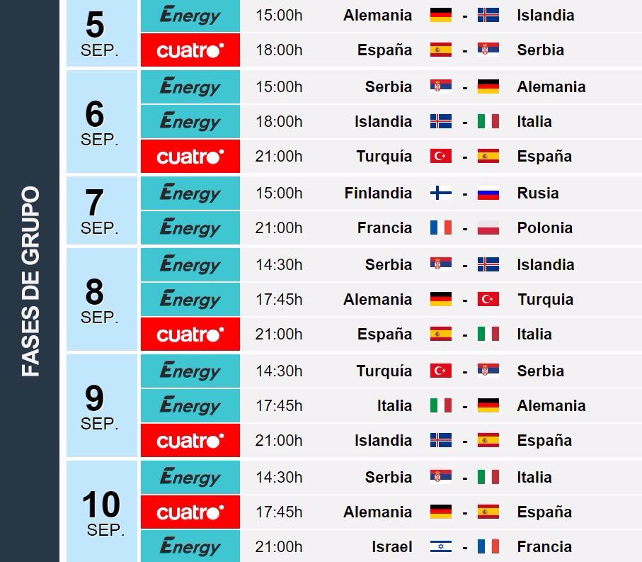 A pocos días del comienzo del Eurobasket 2015, hemos conocido el calendario de retransmisiones de Cuatro y Energy de cara a la primera fase. Los partidos de España podremos seguirlos por Cuatro, mientras que Energy emitirá dos partidos adicionales diariamente, salvo el sábado 5, en el que sólo se emitirá uno.