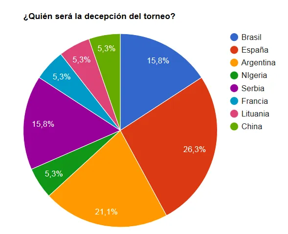 El apartado más abierto de la encuesta planteada entre nuestros colaboradores es el de decidir cuál sería la decepción del torneo. En este apartado es llamativo ver que la selección española aparece como la que más votos ha recibido como selección que decepcionará. También hemos visto antes que una gran parte de los colaboradores la colocaban en puestos de medalla. Lo cierto es que todo lo que no sea tocar metal sería una decepción para el combinado español. Argentina y Brasil, dos selecciones en las que se depositan esperanzas importantes en el torneo aparecen también como candidatos a ser la decepción.