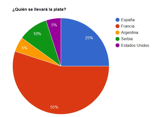 Francia se presenta como máxima candidata a ser el equipo que tenga la ocasión de plantar cara al 'Team USA' en una presumible final olímpica, según la opinión de nuestro equipo de colaboradores. Un 55% de votos colocan al combinado galo como plata en el podium olímpico. España, con un 25% de votos, y Serbia con un 10% son los otros candidatos a ser finalistas, según los votos emitidos.