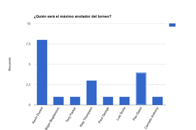A la hora de elegir al máximo anotador del torneo, tenemos un claro dominio de jugadores de la selección norteamericana, con Kevin Durant al frente. Pau Gasol también se cuela entre ese dominio estadounidense, como segundo jugador más votado.