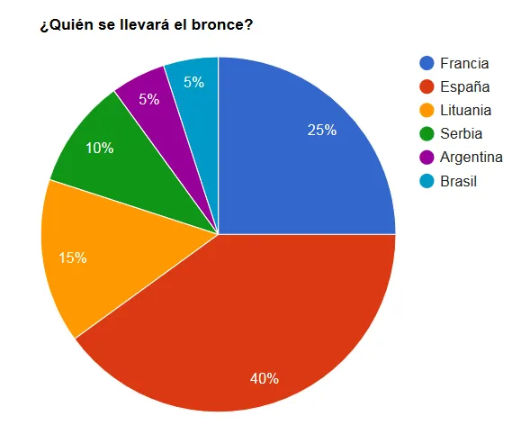 En el bronce es donde sitúan a España la mayoría de nuestros colaboradores. Un 40% posiciona en ese tercer puesto al equipo dirigido por Sergio Scariolo. Francia, Lituania y Serbia también aparecen como candidatos a medalla a tenor de los resultados.