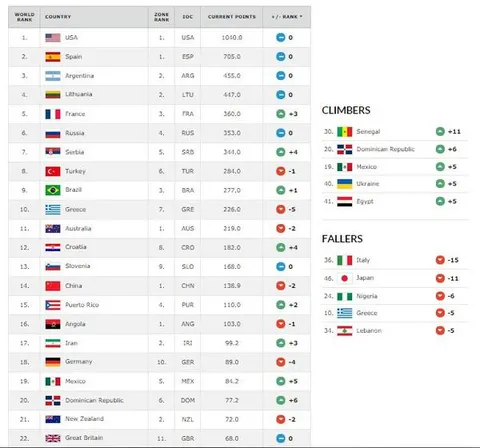 Pese al batacazo en cuartos de final ante Francia, España es el segundo país del ránking, a la misma distancia de Estados Unidos que sobre el tercer clasificado, una Argentina que vive con temor ante el cambio de generación que se avecina. El cuarto clasificado del torneo, Lituania, mantiene su cuarta posición en el ránking FIBA y recorta distancia con el equipo argentino.