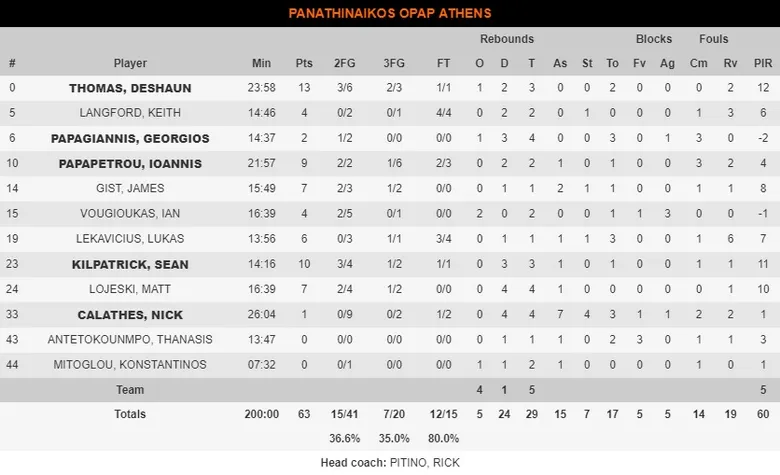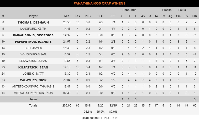 Nick Calathes, anulado. El base griego firmó uno de los peores partidos de la temporada. Con 1 punto, 4 rebotes, 7 asistencias y 4 robos le otorgaron un total de 2 de valoración. Lo peor ha sido su porcentaje de tiro, un sorprendente 0/9 en tiros de 2, 0/2 en triples y 1/2 en tiros libres señalan la clave principal de que Panathinaikos no haya sido capaz de reaccionar.
