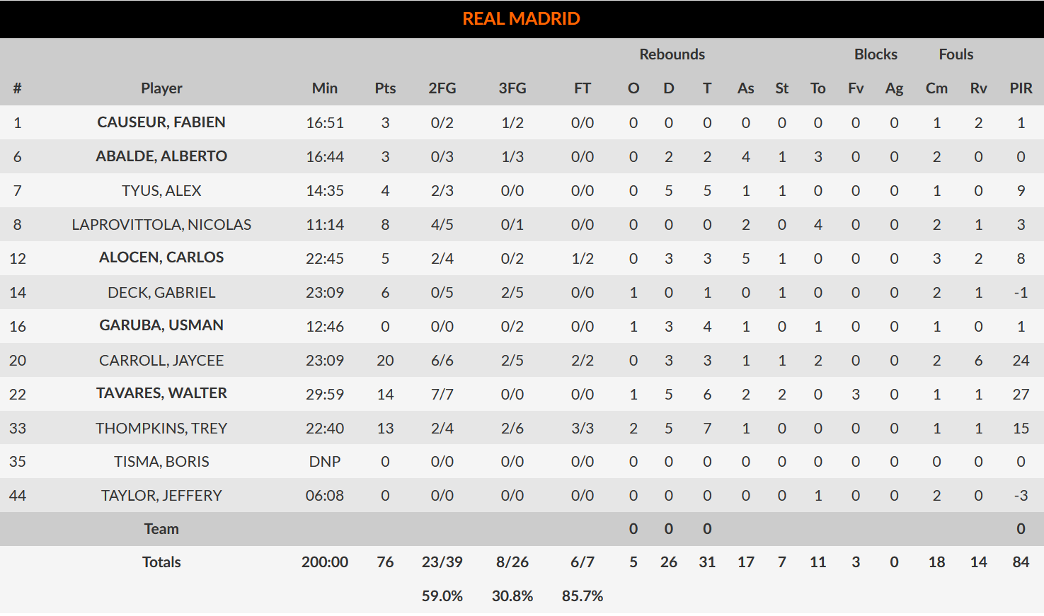 Edy Tavares y Jaycee Carroll jugaron un gran partido, sin que el resto de su equipo pudiera, o supiera, acompañarles. El gigante del Real Madrid cuajó un gran primer cuarto en ataque y una excelente segunda mitad en defensa, muy intenso en el bloqueo y el tapón, con algunas jugadas determinantes y ofreciéndose en ataque siempre que los espacios lo permitían. Ettore Messina le cerró bien en el tercer cuarto, y un corte en la cara fortuito contra Kyles Hines le dejó fuera hasta el último asalto. Alex Tyus acaba de llegar y Usman Garuba es aún muy joven, por lo que el de Cabo Verde se encuentra muy sólo en la intendencia defensiva en noches como la de hoy. Tyus, por cierto, tuvo un debut más que aceptable, jugando con intensidad en defensa y aportando puntos cuando pudo (4 puntos 5 rebotes).